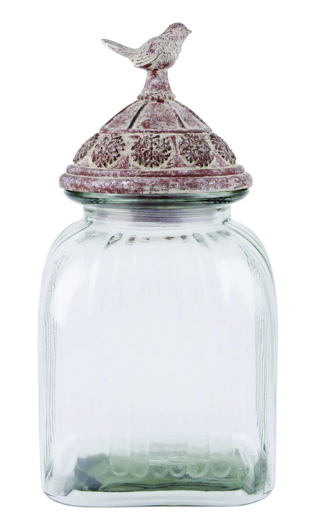 ASHDENE Canister Large Bird is an elegant square shape presented in clear ribbed glass with a rustic bird stopper.