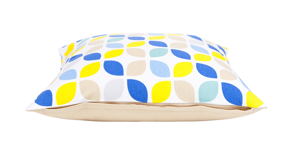 ASHDENE Large Cushion Geometrix Petal is a luxurious cotton cushion featuring Petals in blues, yellow and grey on a white background on the front and a solid colour on the back (grey).