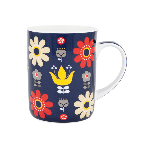 Featuring Scandinavian inspired designs of flowers, fruit and Florals. These are just some of the charming motifs that adorn the mugs, in a contemporary pallet of grey, dark blue, red and yellow.