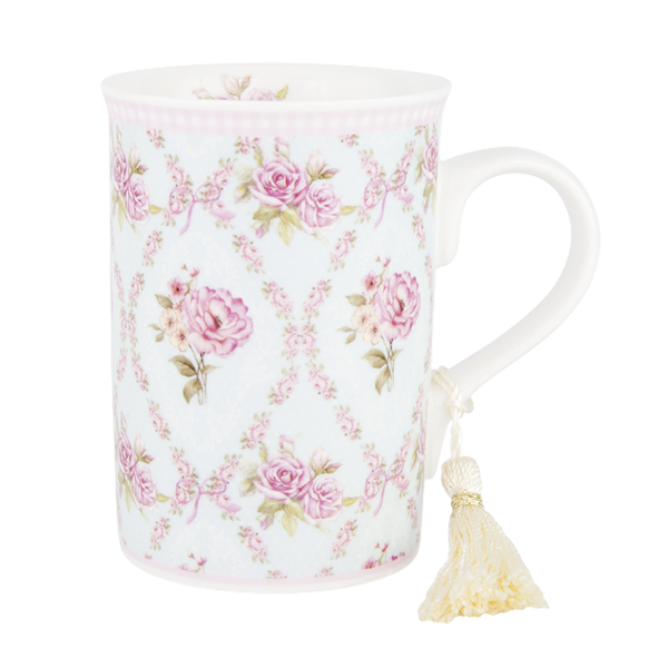 The Floral Prints Collection is a lovely feminine mug range decorated with illustrations of traditional roses in a soft colour palette of light greys, pinks and blues. Pretty floral patterns and tassels adorn the mugs, with satin bow trims on the packaging.