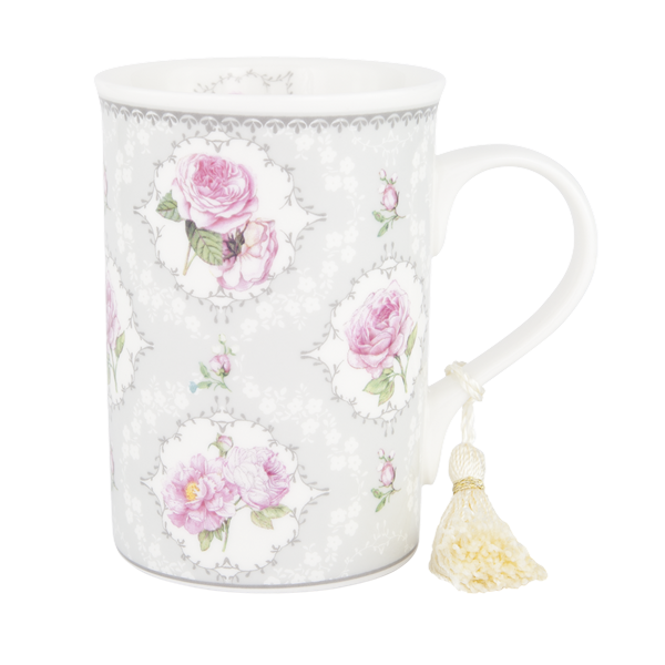 The Floral Prints Collection is a lovely feminine mug range decorated with illustrations of traditional roses in a soft colour palette of light greys, pinks and blues. Pretty floral patterns and tassels adorn the mugs, with satin bow trims on the packaging.