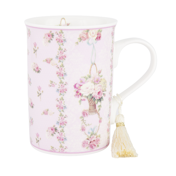 The Floral Prints Collection is a lovely feminine mug range decorated with illustrations of traditional roses in a soft colour palette of light greys, pinks and blues. Pretty floral patterns and tassels adorn the mugs, with satin bow trims on the packaging.