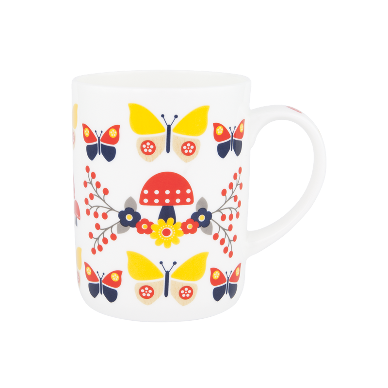 Featuring Scandinavian inspired designs of flowers, fruit and Butterflys. These are just some of the charming motifs that adorn the mugs, in a contemporary pallet of grey, dark blue, red and yellow.