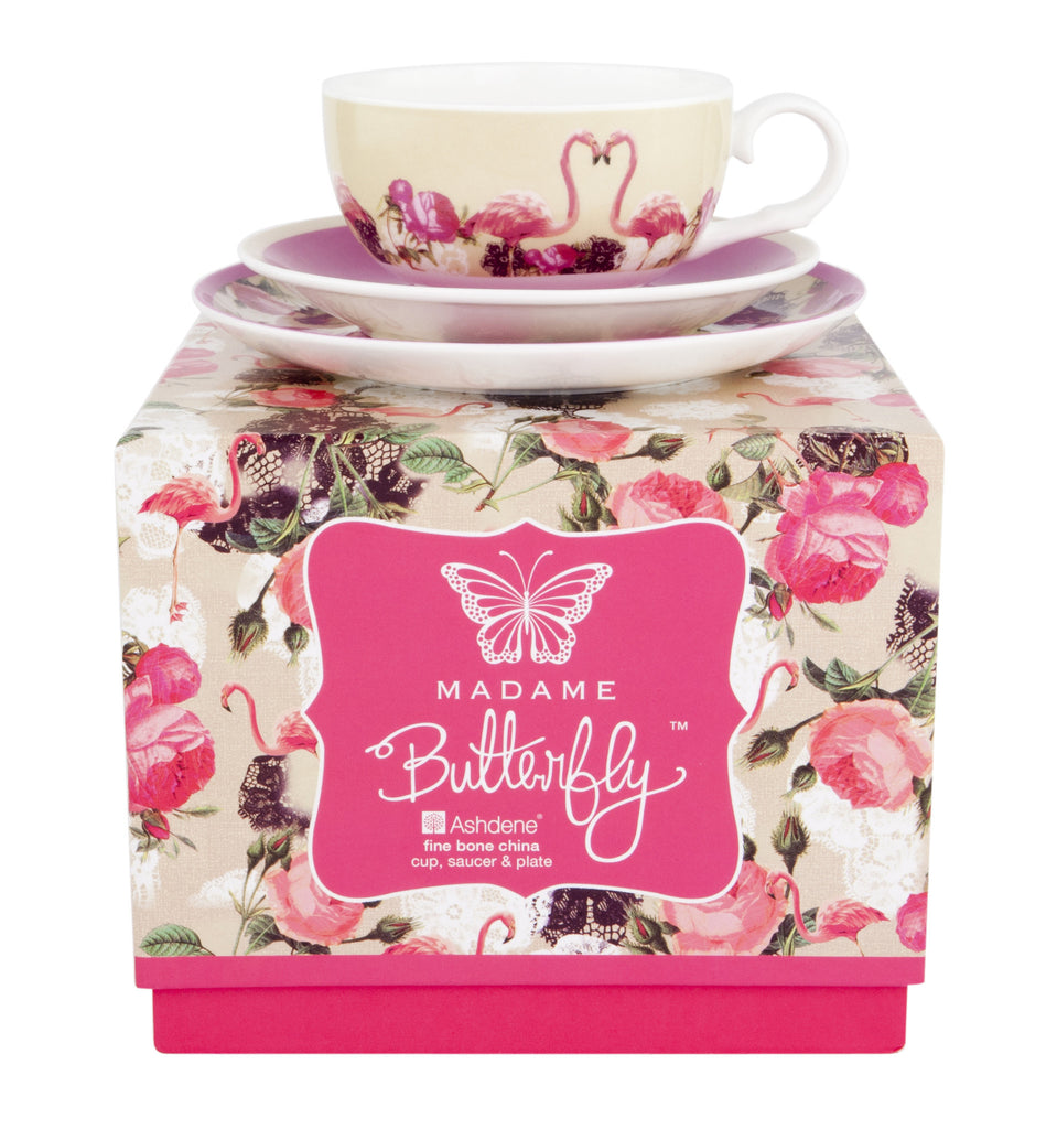ASHDENE Teacup Saucer and Plate set is part of the BRAND NEW Madame Butterfly Flamingo Rose collection.
