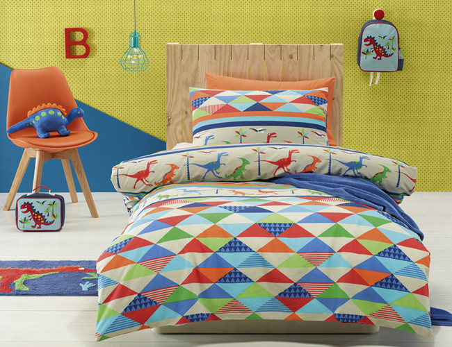 Dino Land Double quilt cover & 1 Pillowcase set. Brighten up your kids room with this double sided quilt cover, dinosaurs on one side and exotic angles on the other.