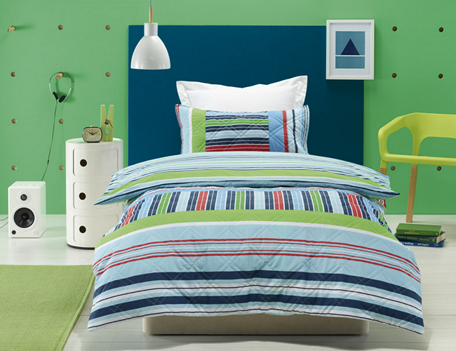 Piper Patch Padded Stripe Queen front Panel quilt cover or light weight comforter set with 2 Pillowcases. The print is a multi-way stripe design in shades of blue, white, green and red, adding a contemporary twist, while a stitched pattern of diamonds creates a lovely quilted finish. This quilt cover set is a great choice for both boys and girls bedrooms, offering both extra warmth and a super stylish look that they'll want to show off to their friends.
